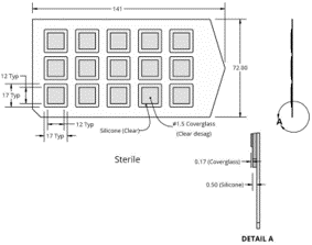 •         產品由上下兩部分構成:上層是No.1.5厚度的玻璃蓋玻片,下層是0.5mm厚度的透明硅膠片,無菌包裝可直接使用。設計上硅膠片較玻璃片略大,比如蓋玻片12*12mm大小,下方的硅膠片17*17mm大小,產品大小特別適于培養皿和培養板使用。包裝時,背襯底板是透明大塑料板,一板15個,一包有5板(共計75個)。